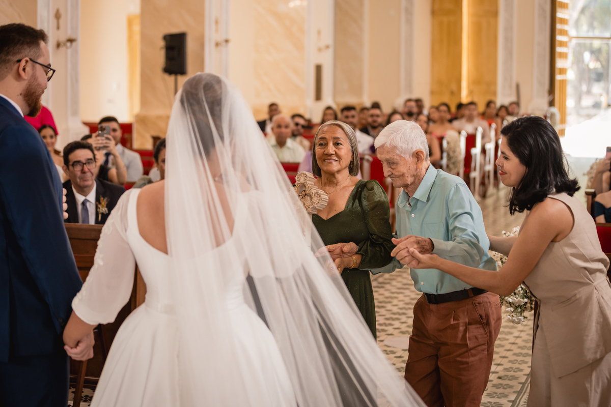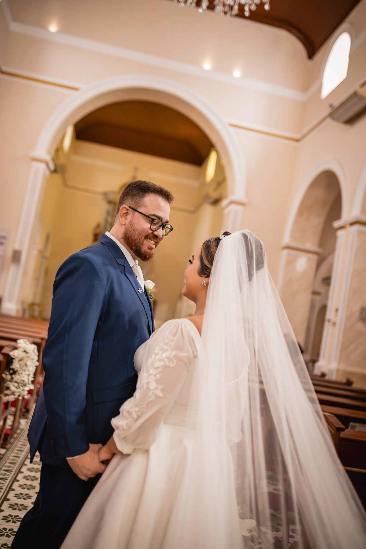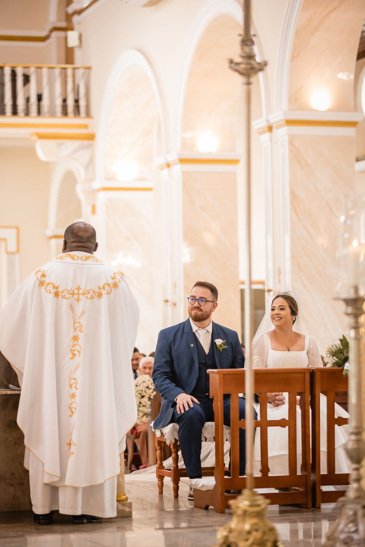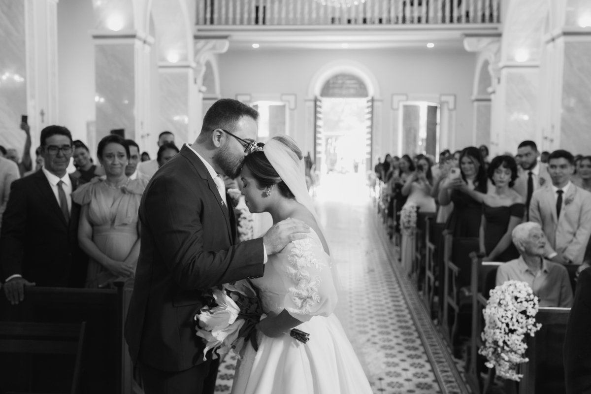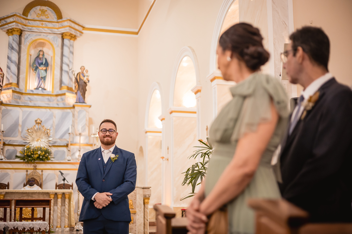 O "sim" foi abençoado por luzes suaves que atravessavam os vitrais e por olhares que carregavam história, entrega e muito sentimento.